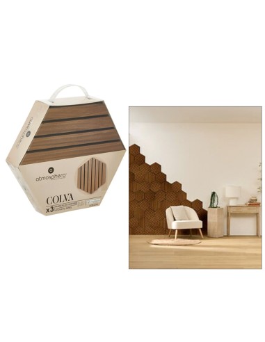 Il Set di 3 pannelli decorativi Colva esagonali 30 x 26 cm in MDF con finitura effetto legno scuro unisce design moderno e comfort acustico. La superficie texturizzata richiama il noce, mentre il retro in feltro nero contribuisce a ridurre l’eco, migliorando l’acustica della stanza.