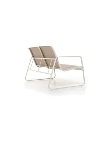 Set Sofa composto da divanetto 2 posti, 2 poltrone e tavolino da caffè. Struttura in tubolare di ferro, sezione ovale, verniciato a polvere epossidica di colore bianco, piano del tavolino in vetro temperato decorato di colore bianco latte, rivestimento seduta e schienale in textilene colore grigio chiaro.