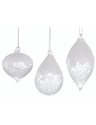 Realizzati in vetro trasparente, questi pendagli sono disponibili in più dimensioni (7x7x11h – 8x8x8h – 7x7x13h) e si adattano perfettamente ad alberi di Natale, ghirlande, centrotavola e composizioni decorative. La loro trasparenza riflette la luce delle luminarie, creando un effetto scintillante e sofisticato.