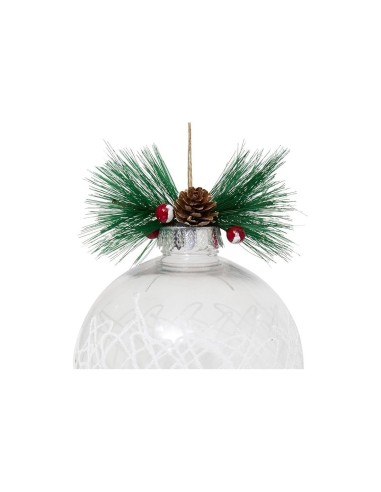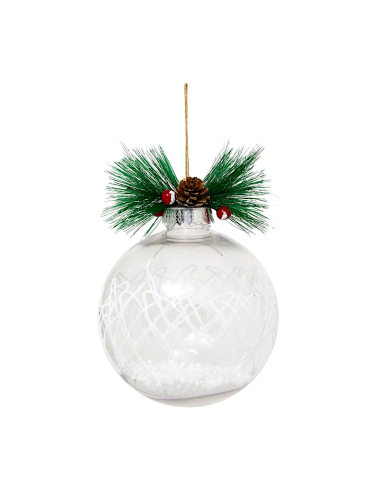 Realizzata in plastica trasparente resistente, racchiude al suo interno un ramo di agrifoglio decorativo immerso in palline di polistirolo bianche, che ricordano la neve fresca.