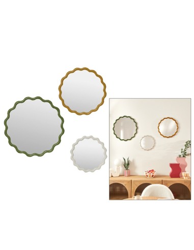 Il set Judy comprende tre specchi rotondi dal bordo ondulato, perfetti per aggiungere stile e luminosità agli ambienti. Realizzati in plastica resistente, combinano leggerezza e praticità. Ogni specchio ha dimensioni di 50 x 1,8 x 50 cm e viene proposto in un mix di colori eleganti: verde, ocra e beige crema. Ideali per soggiorni, camere o ingressi, questi specchi sono un dettaglio decorativo versatile e attuale.
