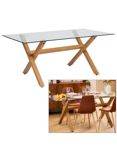 Il tavolo da pranzo Jorel è la perfetta combinazione tra design moderno ed estetica naturale. Il suo ampio piano in vetro temperato da 180 x 90 cm offre spazio abbondante per cene conviviali, riunioni familiari o momenti di relax.