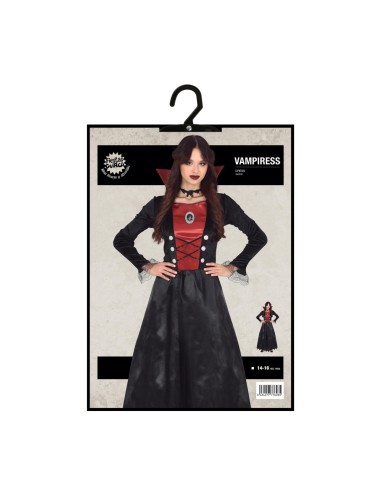 Costume Vampira per ragazze, taglia 14-16 anni, composto da un elegante abito lungo. Questo costume a tema Halloween è perfetto per chi desidera un look misterioso e affascinante da vampira. Realizzato con materiali di alta qualità, offre comfort e stile durante tutta la giornata o serata di festa. Ideale per feste a tema, sfilate e celebrazioni di Halloween.