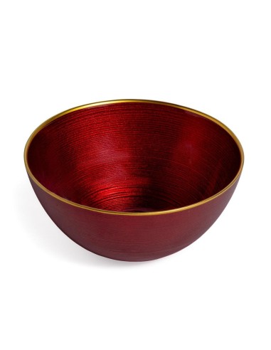 Ciotola tonda in vetro con colori rosso e oro.